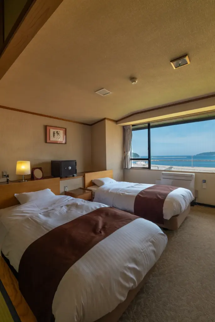 さらに、部屋からの眺めの良さも自慢のひとつ。大きな窓からは宮古湾の穏やかな風景を楽しめ、ゆったりとした気分を味わうことができる。